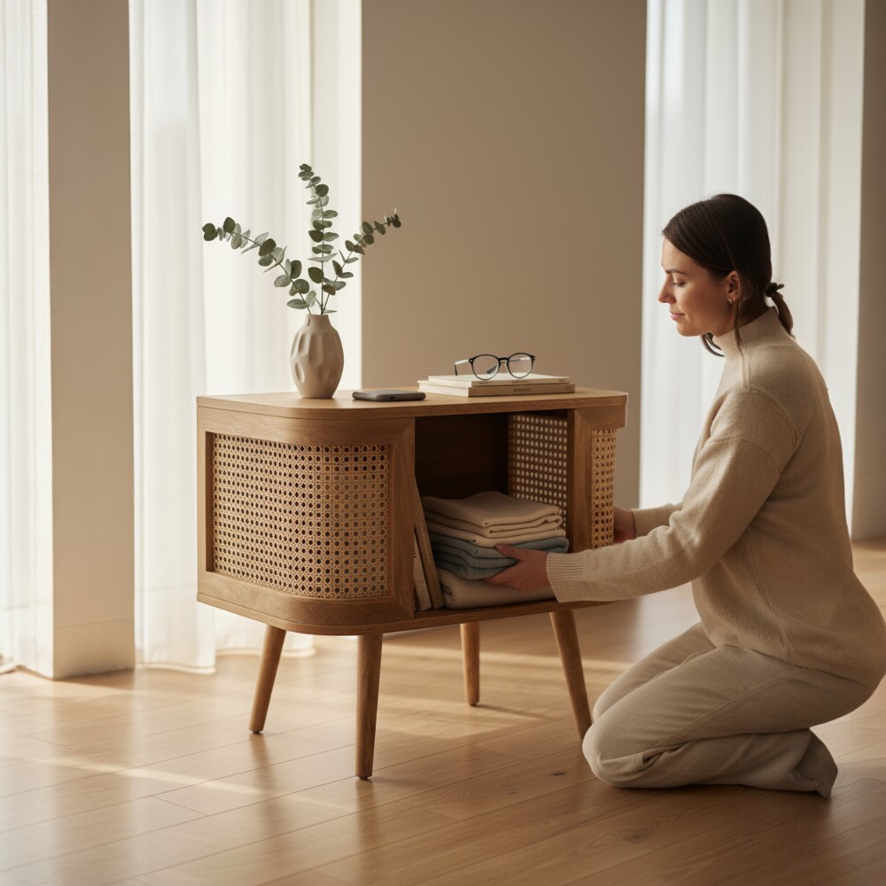 Be the first to review “Wood Curved Rattan Bedside Table, Natural”