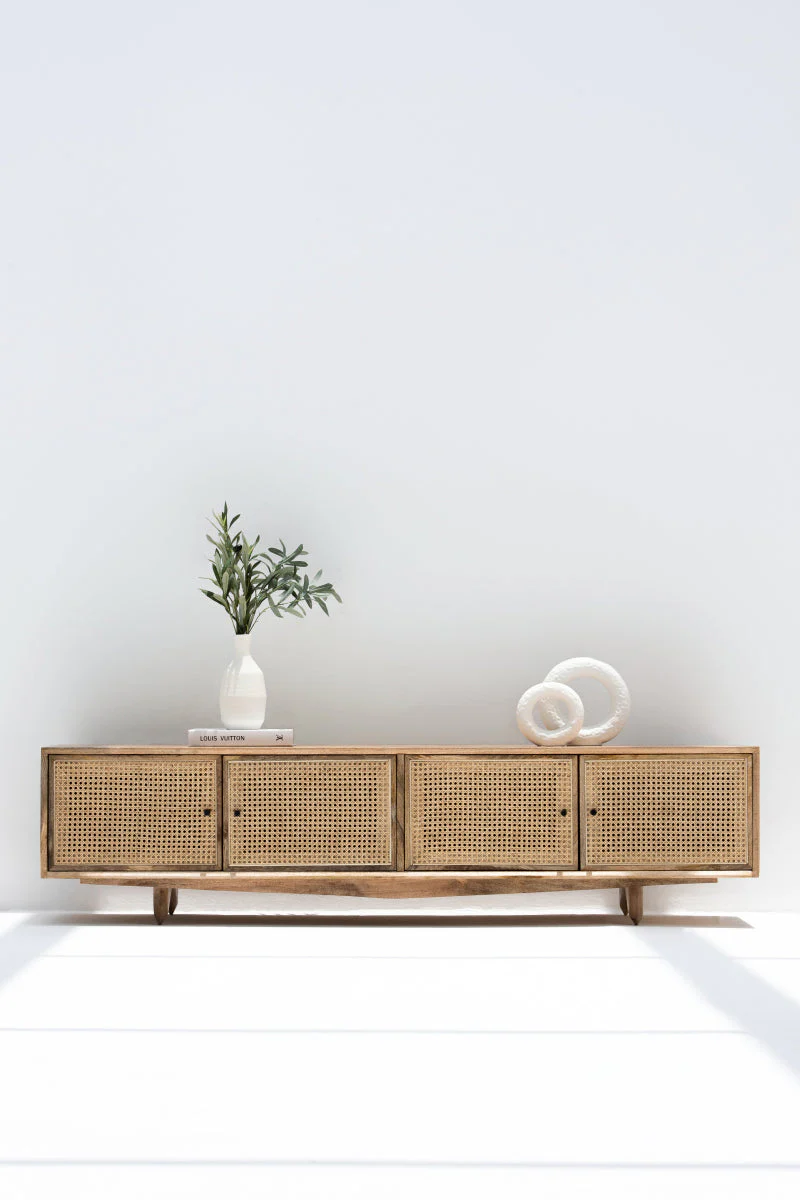 your living space with the Catalina Rattan Doors Media Unit, a perfect fusion of natural elegance and rustic design. Crafted from premium mango wood, this media unit showcases a sleek, elongated shape that provides ample surface area for your entertainment essentials. The unit features four intricately woven rattan doors, adding a touch of artisanal charm and texture to the piece. These rattan doors not only enhance the aesthetic appeal but also offer convenient storage space, keeping your media equipment and accessories neatly organized and out of sight.