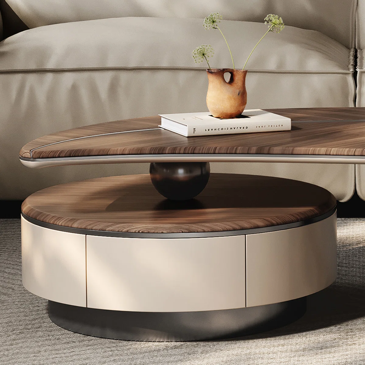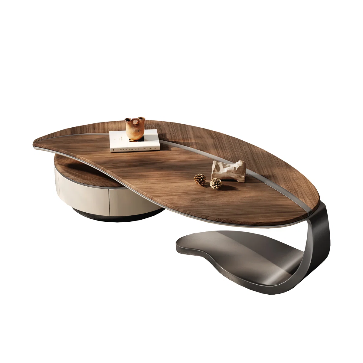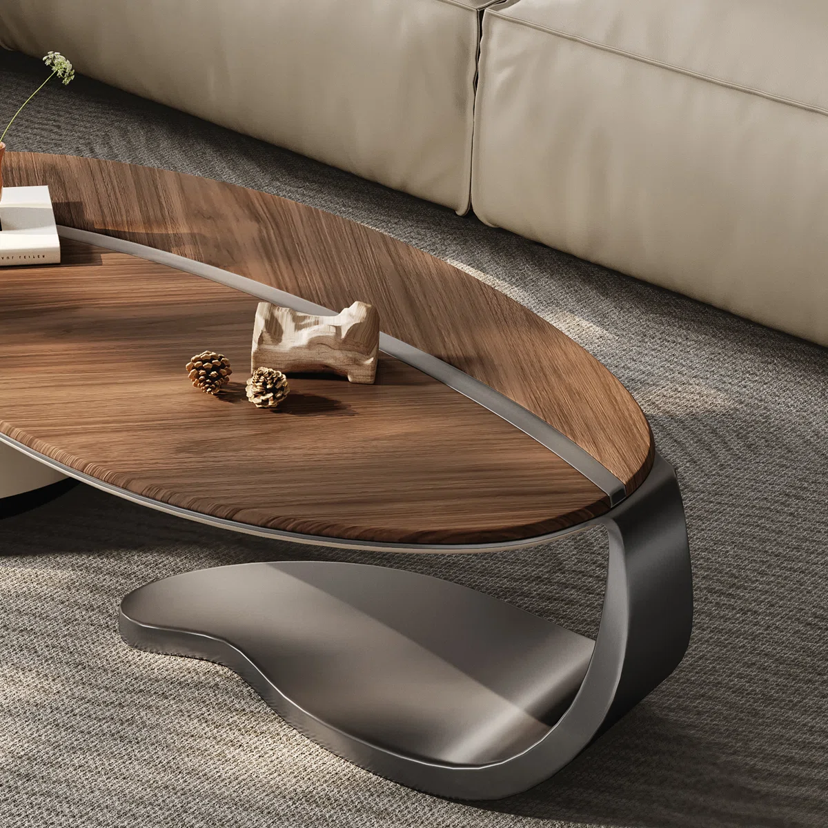 This modern coffee table blends innovative design with timeless elegance, showcasing the natural warmth of wood grain paired with the sleek sophistication of titanium-plated metal. Its unique, asymmetrical shape is inspired by the fortune tree, symbolizing grace and prosperity. Crafted from high-quality materials with meticulous attention to detail, this table perfectly balances functionality with contemporary style. As a striking centerpiece, it adds a touch of refinement and charm to modern living spaces, elevating the ambiance of any room.