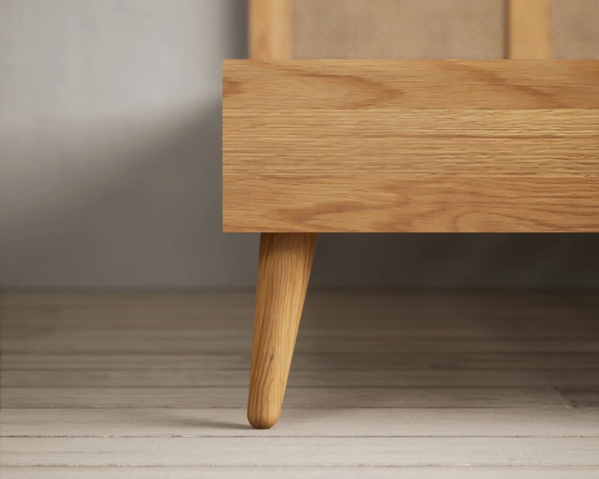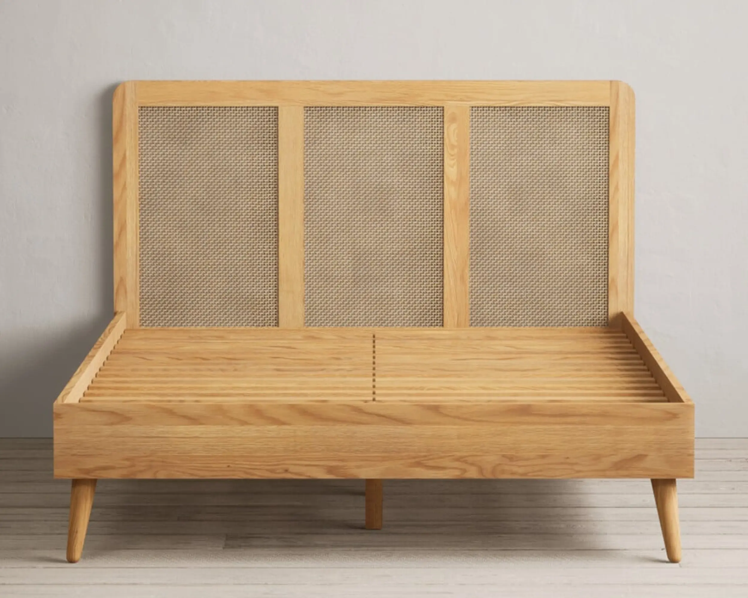 This bed combines a Oak wood frame with a woven rattan headboard, creating a cozy and inviting atmosphere. Available in king and queen sizes, it offers a choice of natural, walnut, or black finishes to suit various interior styles.