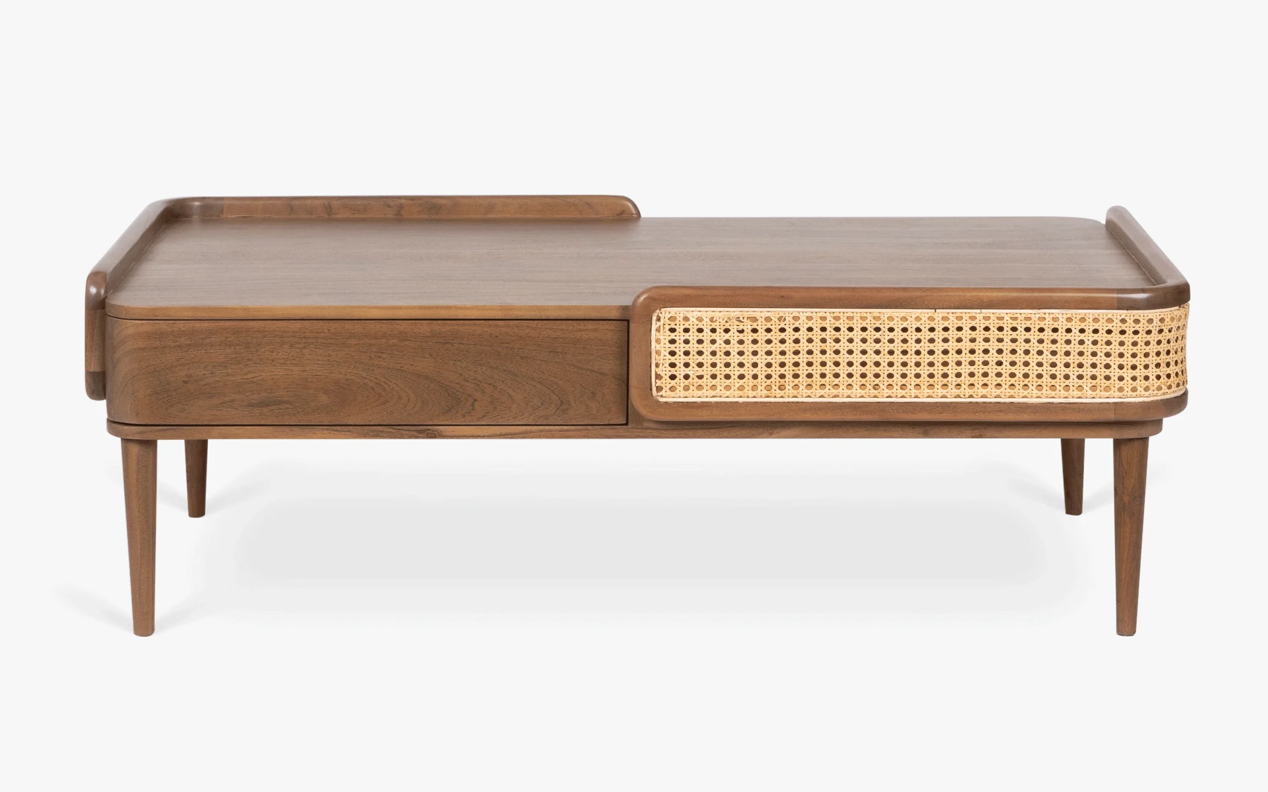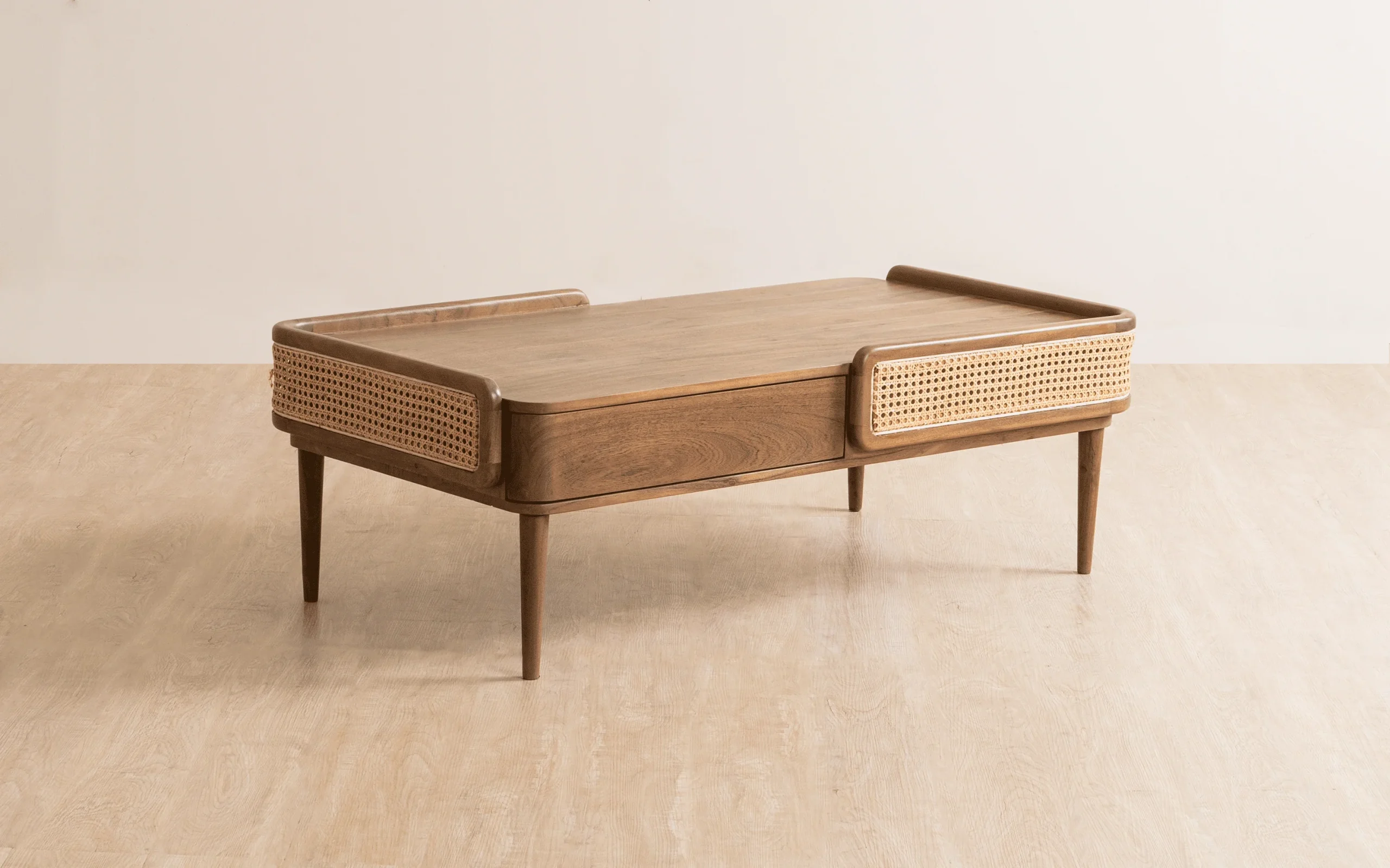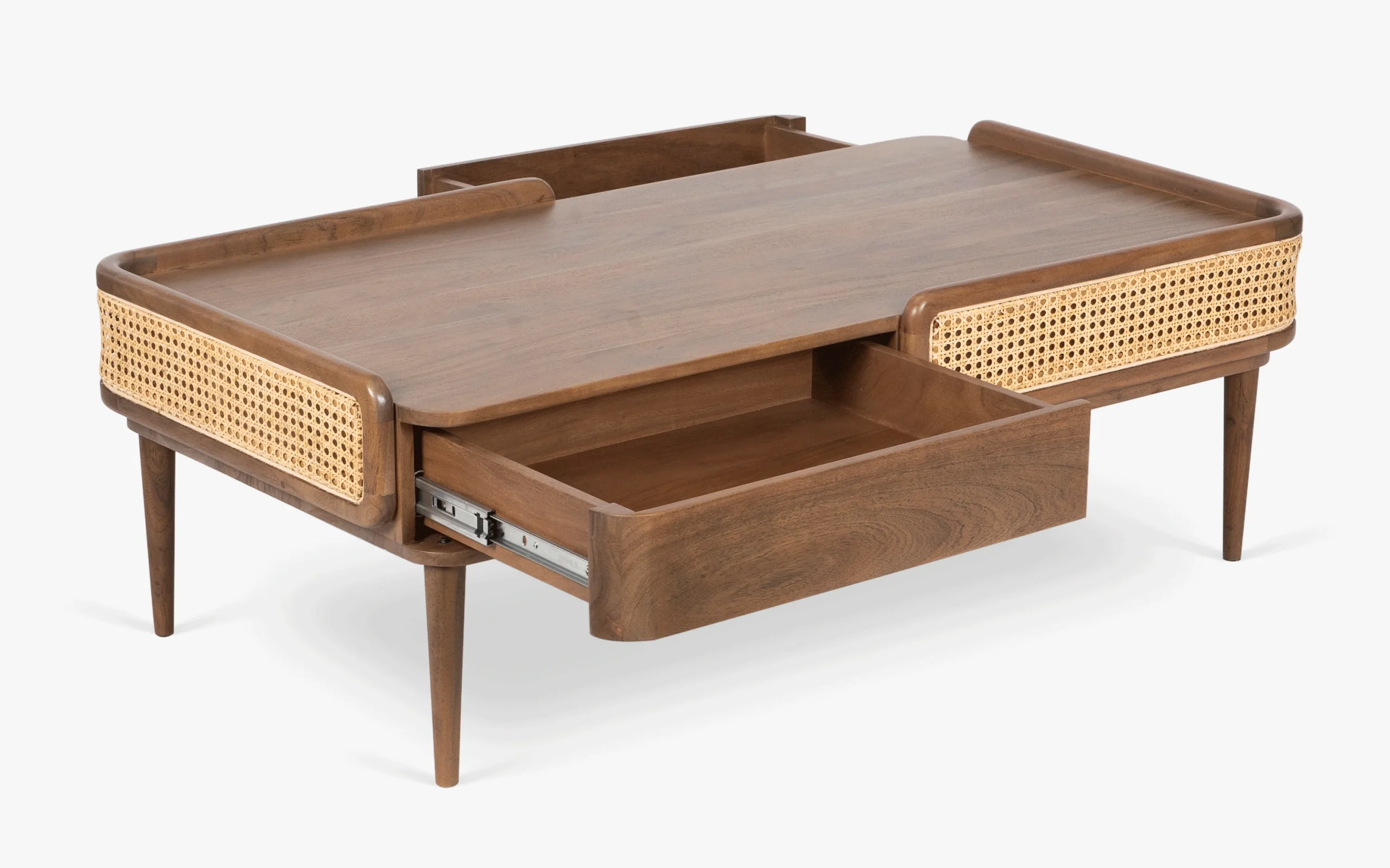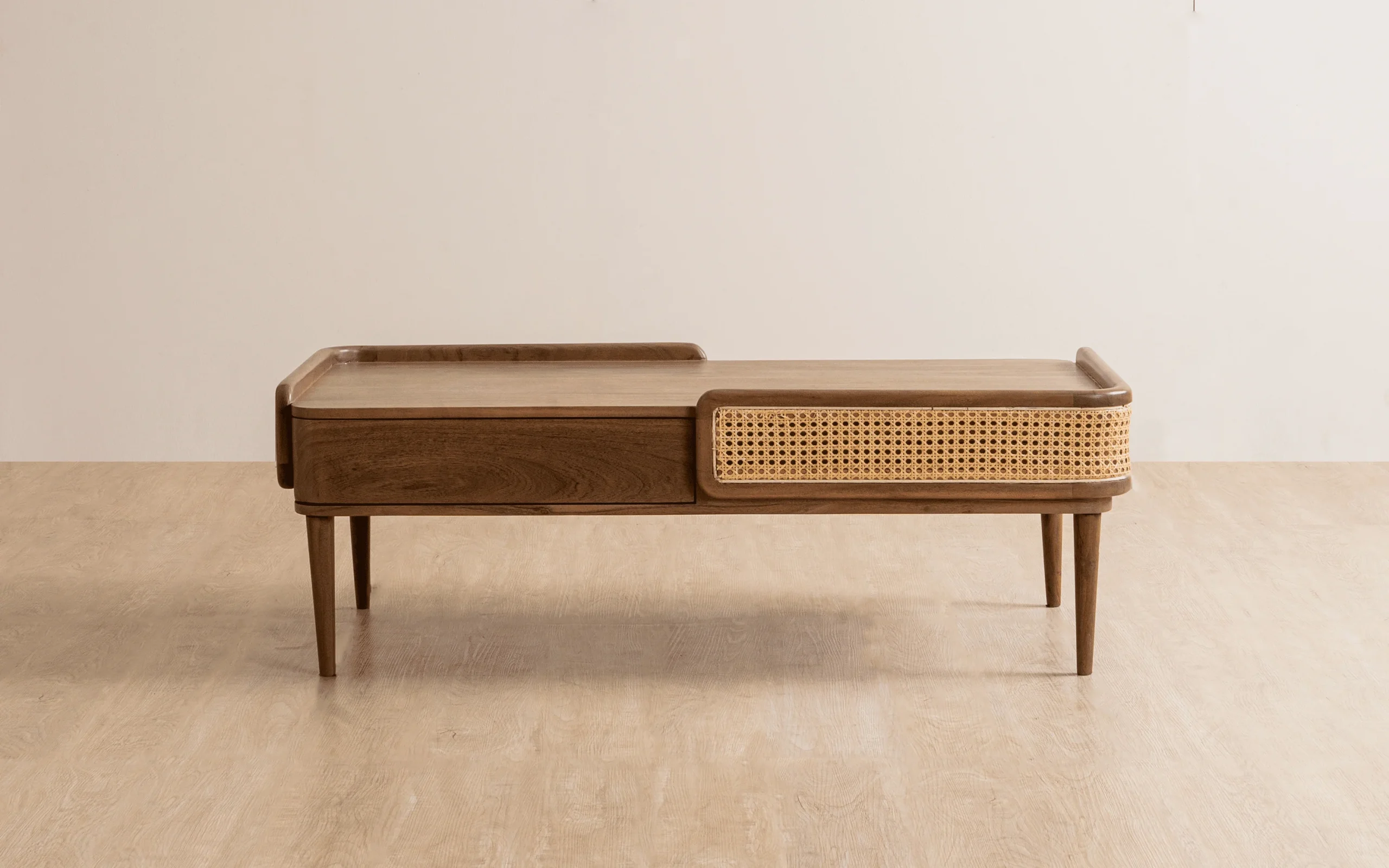 The Meadow Coffee Table seamlessly combines sleek design with functionality. Crafted from acacia wood and cane, this mango coffee table boasts a sophisticated walnut finish, making it a stylish addition to any living space. The modern design is enhanced by practical storage features, perfect for keeping your living area tidy. Ideal for those seeking a wooden coffee table with modern design, the Meadow table offers both aesthetic appeal and utility.