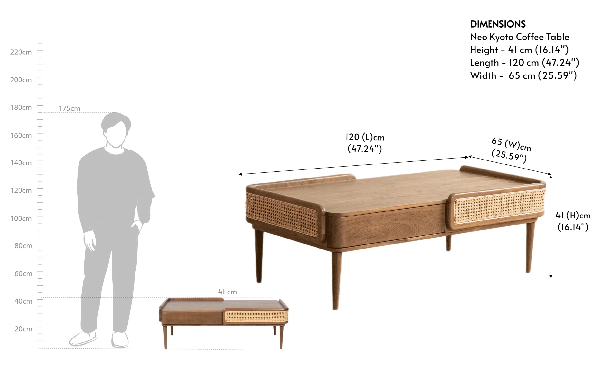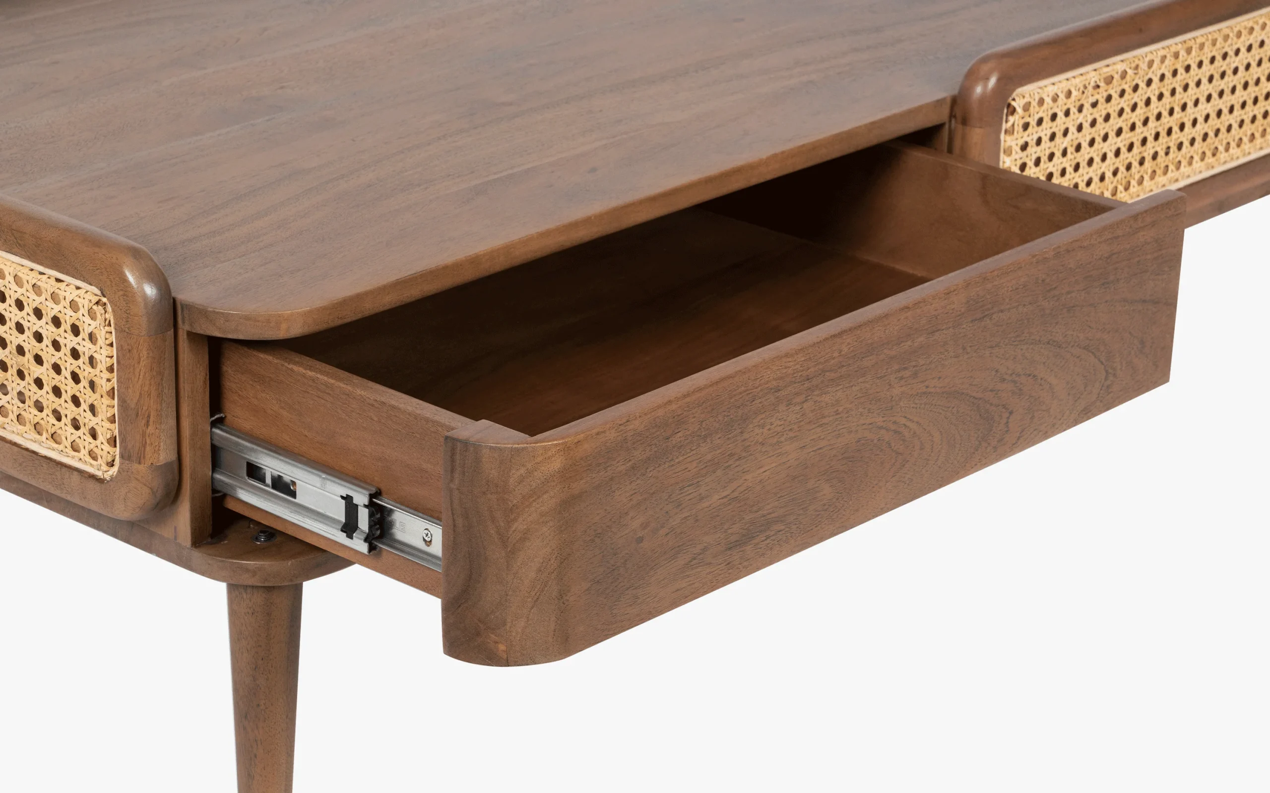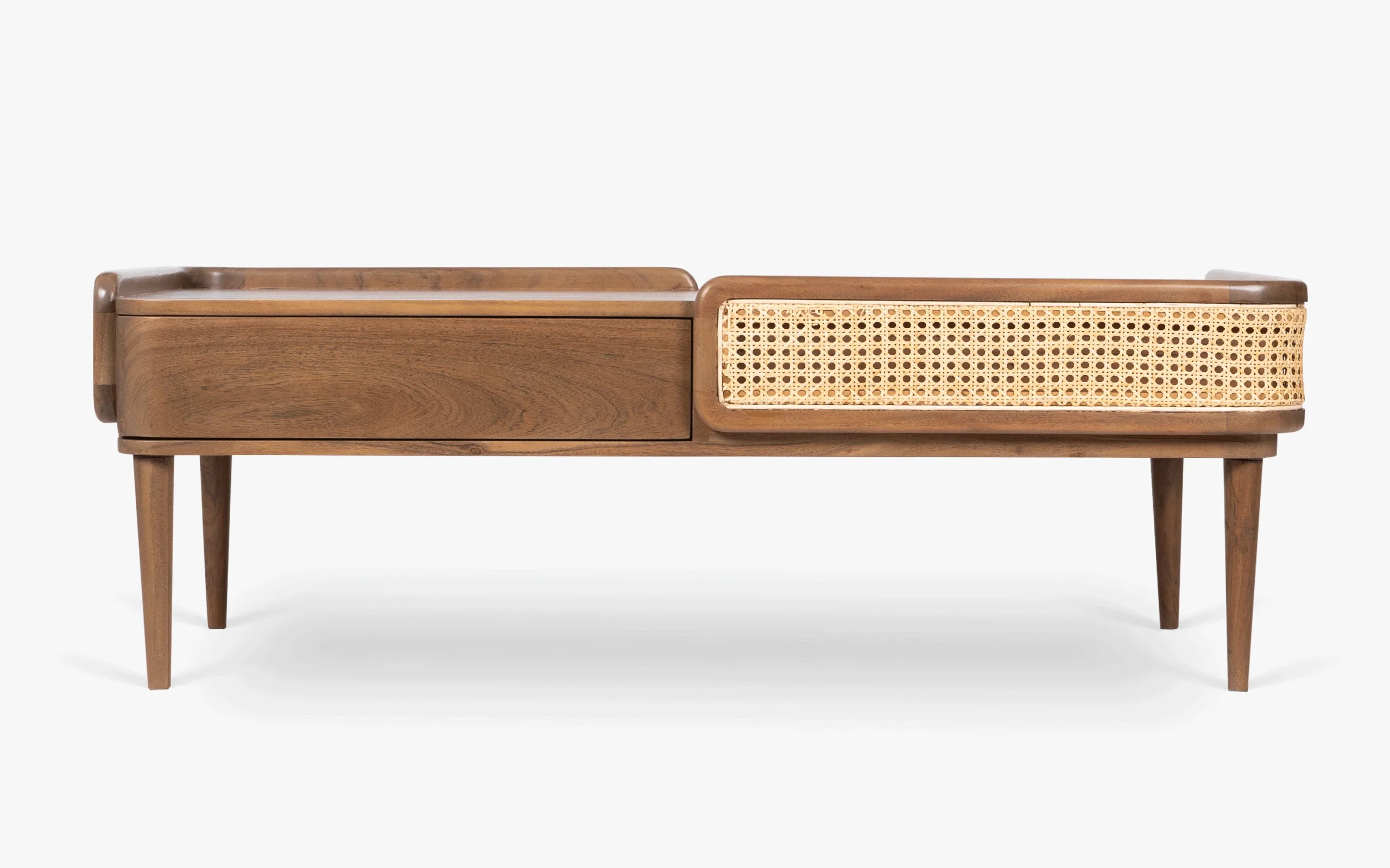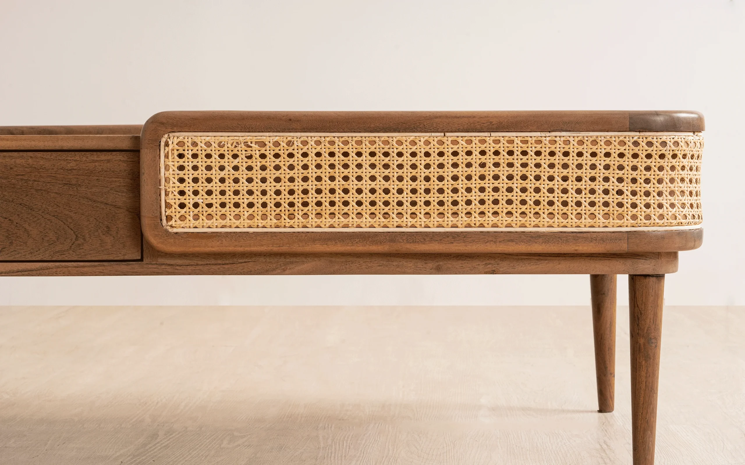 The Meadow Coffee Table seamlessly combines sleek design with functionality. Crafted from acacia wood and cane, this mango coffee table boasts a sophisticated walnut finish, making it a stylish addition to any living space. The modern design is enhanced by practical storage features, perfect for keeping your living area tidy. Ideal for those seeking a wooden coffee table with modern design, the Meadow table offers both aesthetic appeal and utility.