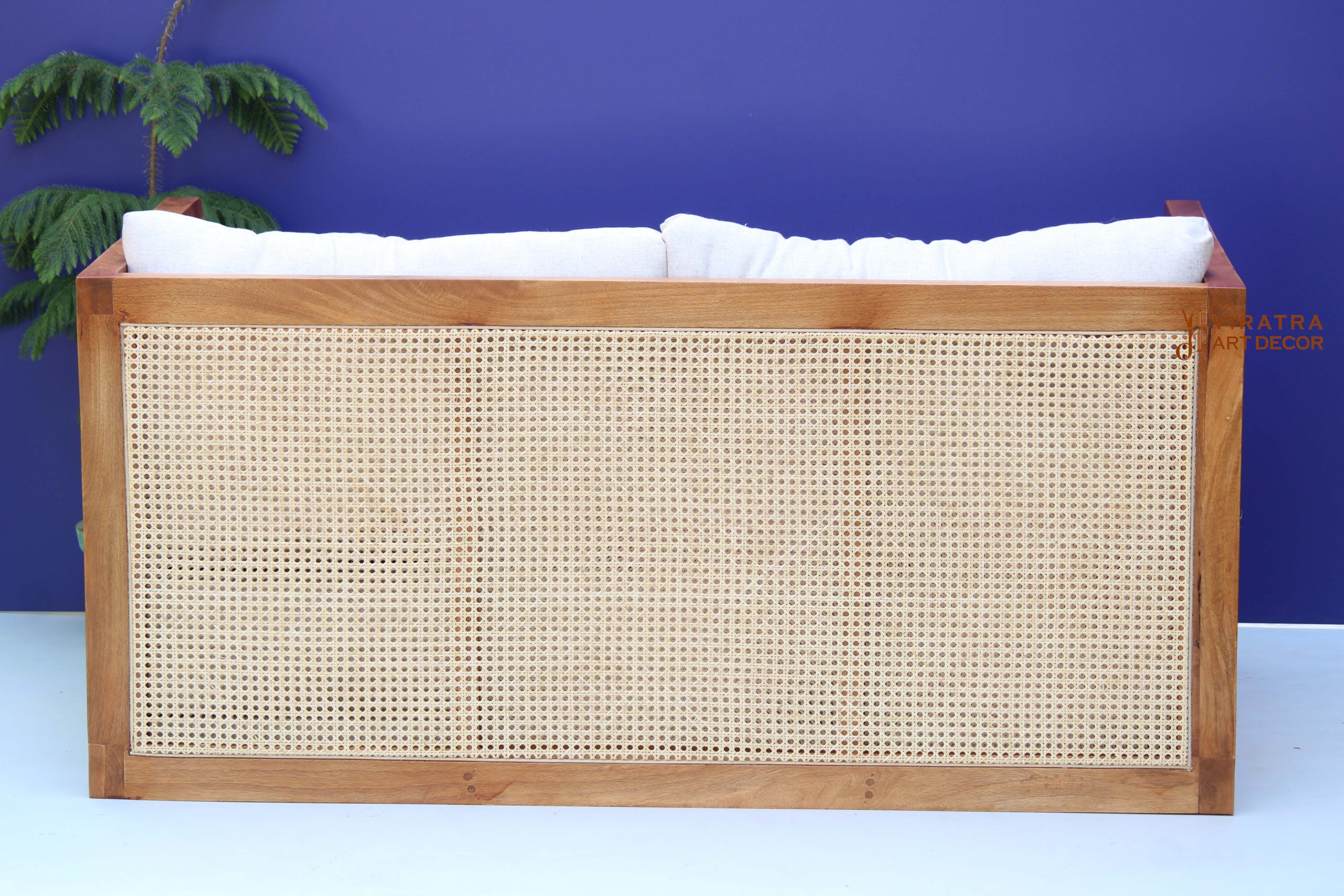 Mango Wood Sofa & Bed, accentuated with traditional rattan weave detailing. This dual-purpose furniture piece effortlessly transitions between a cozy sofa and a spacious daybed, making it ideal for modern compact living.