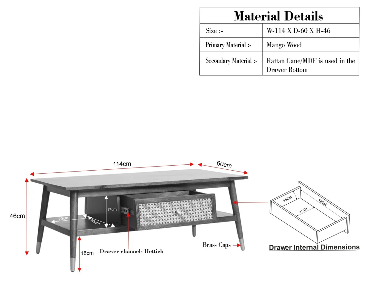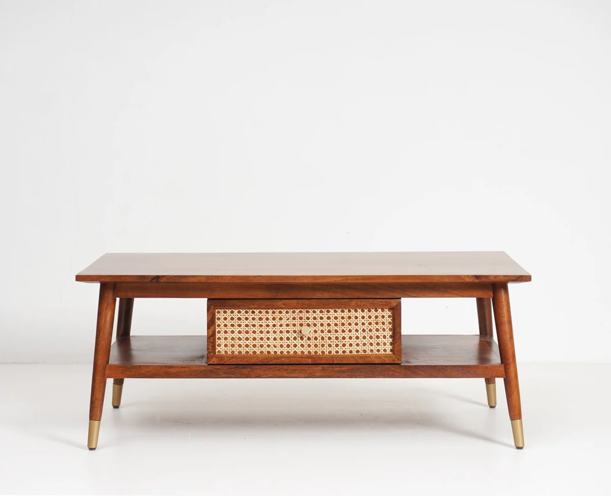 Solid Wood Rattan Cane One Drawer Coffee Table – Brown Finish