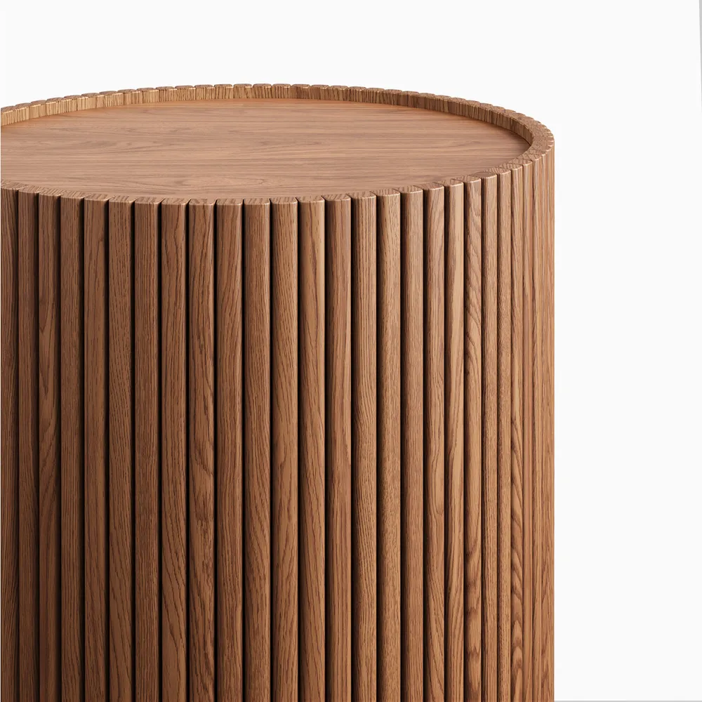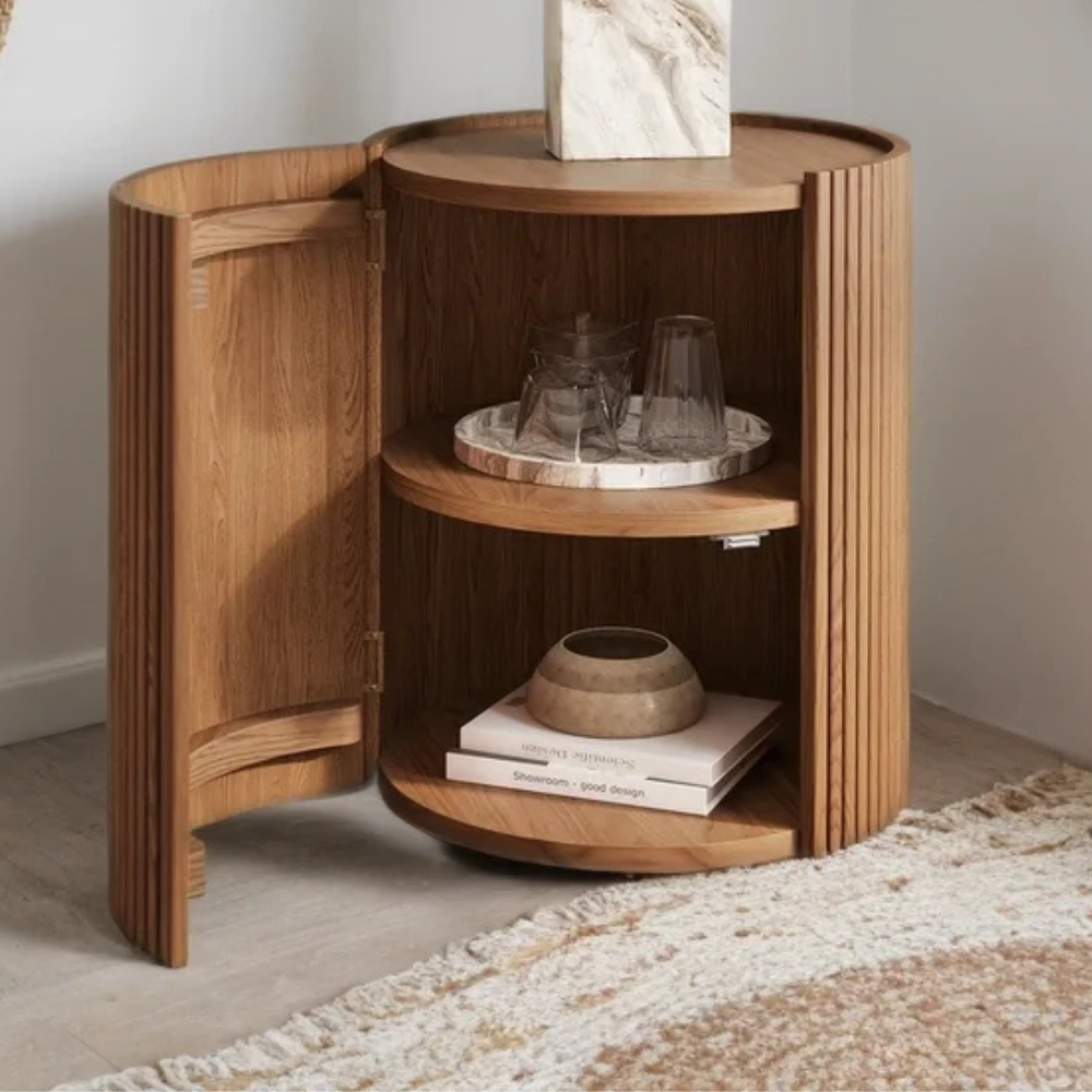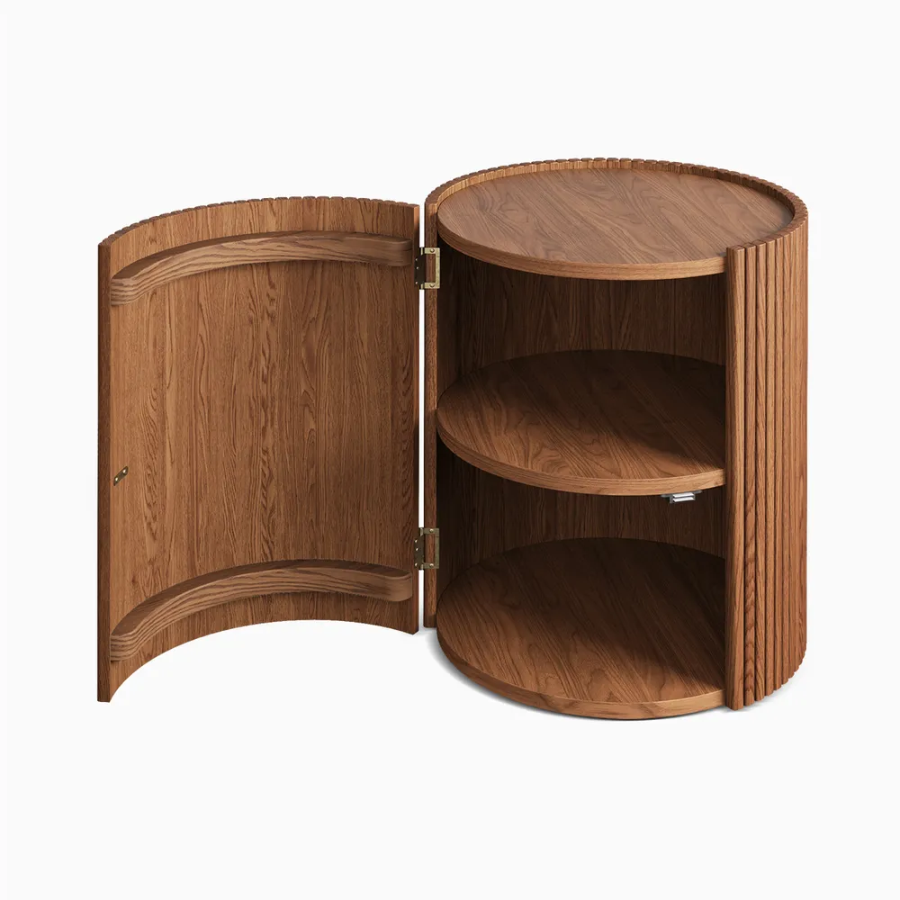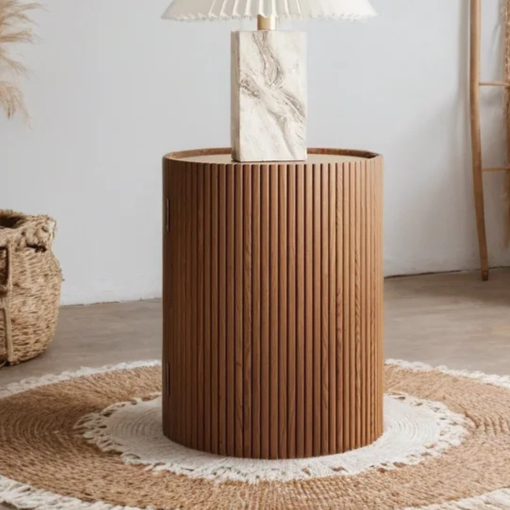 This side table combines functionality with aesthetic appeal, featuring a rich wooden finish and elegant ribbed detailing. The round shape and concealed storage offer practicality, while the open shelves provide space for displaying decor. Its harmonious blend of form and function makes it a perfect addition to any living space, exuding warmth and sophistication